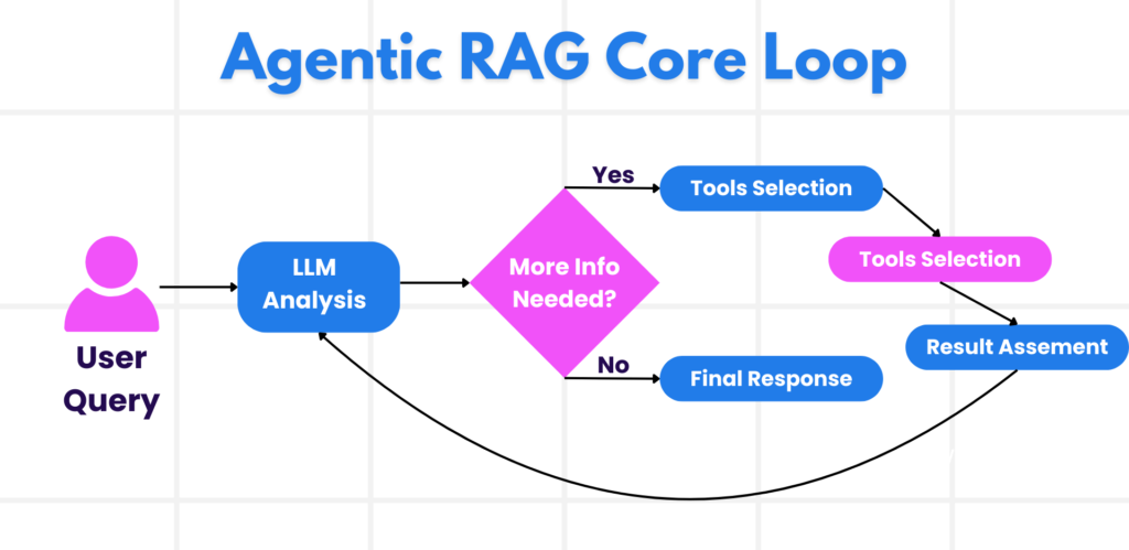 At its core, Agentic RAG is an AI paradigm where the model autonomously drives the workflow. Instead of a fixed path, it uses a loop of LLM calls and tool calls, each step informed by the previous results. If the model identifies missing data, malformed queries, or incomplete reasoning, it will refine its approach, rewrite queries, switch retrieval methods, or even combine multiple tools such as SQL databases, vector search engines, and APIs. This ability to decide how to solve the problem—rather than blindly following a script—is what makes the system truly “agentic.”