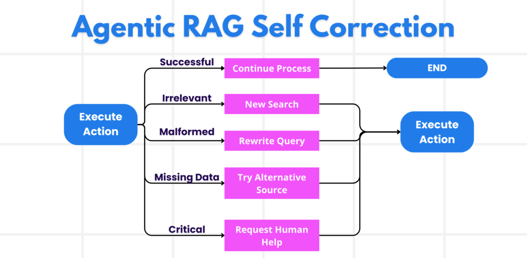 Failure is not an end-point in Agentic RAG—it’s part of the workflow. When the system encounters irrelevant results, malformed queries, or gaps in reasoning, it triggers self-correction. It may rewrite search queries, adjust SQL statements, or switch retrieval tools entirely. In some cases, it uses diagnostic functions to debug its own reasoning steps. And when uncertainty remains high, the system can escalate for human review, integrating that feedback into the ongoing session. This self-correcting loop makes Agentic RAG far more robust than traditional, one-shot retrieval systems.